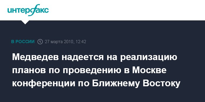 Москва. 27 марта. INTERFAX.RU - Президент России Дмитрий Медведев выступает за созыв в Москве международной конференции по урегулированию арабо-израильского конфликта.