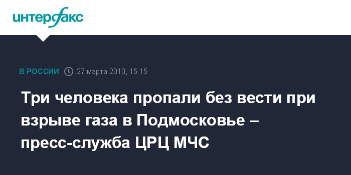 Москва. 27 марта. INTERFAX.RU - По последним данным, три человека числятся пропавшими без вести в результате взрыва бытового газа в Подмосковье. "По последним уточненным данным, три человека числятся пропавшими без вести, один погиб, еще двое с травмами различной степени тяжести находятся в больнице", - сообщил "Интерфаксу" руководитель пресс-службы Центрального регионального центра МЧС России Елена Смирных. По ее словам, на месте взрыва в жилом доме работают 132 человека и 41 единица техники.
