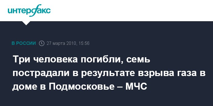 Москва. 27 марта. INTERFAX.RU - Три человека, по последним данным, погибли, семь получили травмы результате взрыва бытового газа в жилом доме в Подмосковье. "По уточненной информации, три человека погибли, еще семь пострадали, трое числятся пропавшими без вести", - сообщили "Интерфаксу" в МЧС России по Московской области.