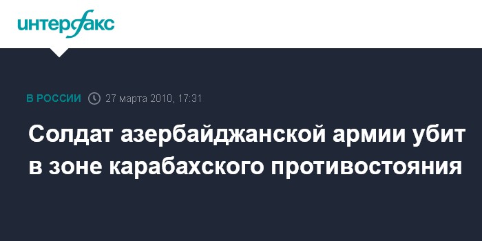 Баку. 27 марта. INTERFAX.RU - Военнослужащий азербайджанской армии получил смертельное пулевое ранение в зоне соприкосновения армянских и азербайджанских войск. Азербайджанская телекомпания ANS сообщает со ссылкой на родственников погибшего солдата, что 20-летний Вюгар Панахир, житель Геранбойского района, проходил военную службу на территории Физулинского района Азербайджана. В Минобороны Азербайджана информацию о гибели солдата подтвердили.