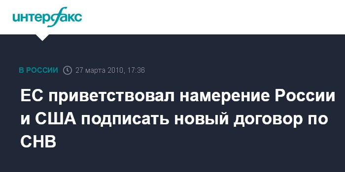 Брюссель. 27 марта. INTERFAX.RU - Европейский союз приветствовал намерение России и США подписать новый договор по СНВ. "Я горячо поздравляю Соединенные Штаты и Россию с завершением переговоров о новом договоре СНВ", - заявила верховный представитель ЕС по иностранным делам и политике безопасности Кэтрин Эштон. "Подписание договора даст мощный позитивный сигнал предстоящей в мае в Нью-Йорке конференции по Договору о нераспространении ядерного оружия и будет способствовать ускорению глобальных мер по разоружению", - подчеркнула она.