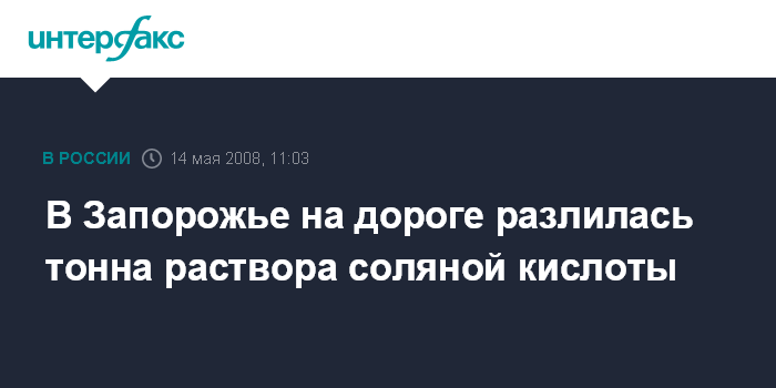 Москва. 14 мая. INTERFAX.RU – В Запорожье во время перевозки с завода "Кремнийполимер" 17 пластиковых емкостей с 30-процентным раствором соляной кислоты на дорогу вытекло 980 кг раствора. Жилых и административных зданий вблизи места разлива нет.