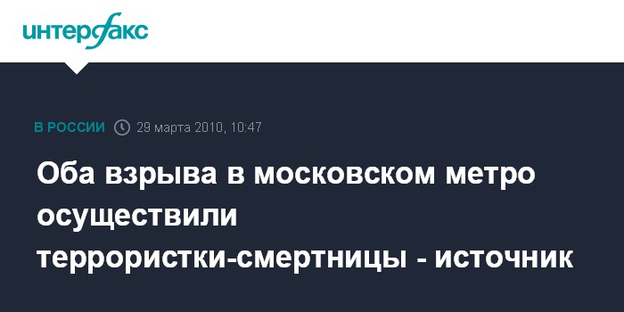 Москва. 29 марта. ИНТЕРФАКС - По предварительным данным, взрывы в московском метро на станциях "Лубянка" и "Парк культуры" совершили "шахидки", сообщил "Интерфаксу" источник в российских силовых структурах.
