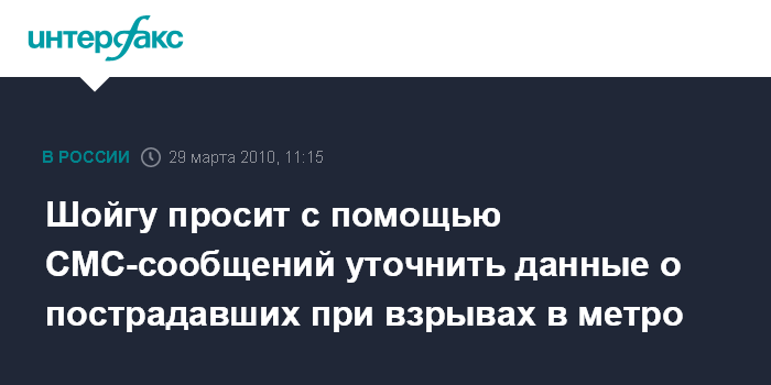 Москва. 29 марта. INTERFAX.RU - Глава МЧС России Сергей Шойгу просит операторов мобильной связи направить жителям города Москвы СМС-сообщения с просьбой связаться со своими близкими и родными, чтобы таким образом уточнить данные о пострадавших и погибших в результате взрывов в метро.