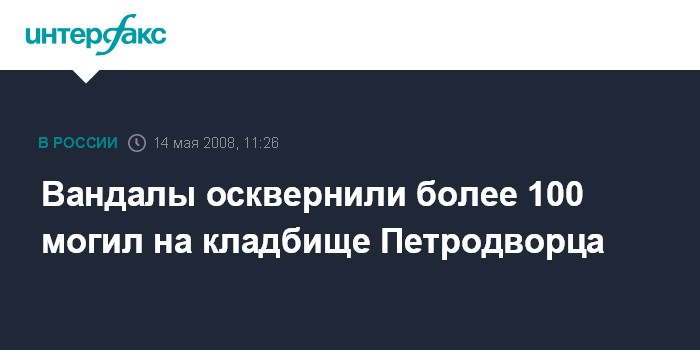Санкт-Петербург. 14 мая. INTERFAX.RU - На городском кладбище Петродворца в ночь на вторник осквернены и разрушены более 100 могил, разрушив более 70 памятников и 30 крестов, сообщил "Интерфаксу" представитель отдела ритуальных услуг городского комитета экономического развития. Он отметил, что принцип отбора памятников, которые подвенрглись разрушению, пока непонятен - разбиты могилы военных, цыган и армян. Но при этом собеседник агентства отверг версию о том, что это сделала "пьяная компания или бездомные".