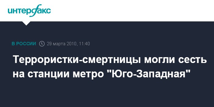 Москва. 29 марта. INTERFAX.RU - По предварительным данным, две женщины-террористки рано сели утром в метро на станции "Юго-Западная", сообщил "Интерфаксу" источник в руководстве метрополитена.
