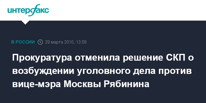Москва. 29 марта. INTERFAX.RU - Московский прокурор отменил постановление о возбуждении уголовного дела в отношении заммэра столицы Александра Рябинина.
