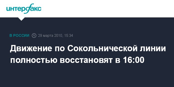 Москва. 29 марта. INTERFAX.RU - Первый заместитель мэра в правительстве Москвы Петр Бирюков заявил, что полностью движение по Сокольнической линии метрополитена восстановят в 16:00.