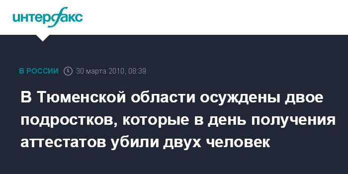 Москва. 30 марта. INTERFAX.RU - Тюменский областной суд вынес обвинительный приговор двум подросткам из села Червишево Тюменского района, убившим двух односельчан, сообщает пресс-служба областной прокуратуры во вторник.