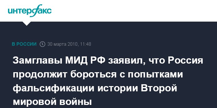 Москва. 30 марта. INTERFAX.RU - Россия продолжит бороться с попытками фальсификации истории Второй мировой войны и умалением роли СССР в достижении победы в этой войне, заявил заместитель министра иностранных дел РФ Александр Яковенко.