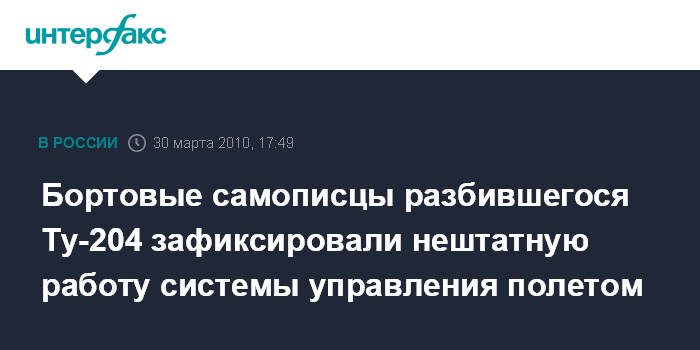 Москва. 30 марта. INTERFAX.RU - Бортовые самописцы разбившегося в Подмосковье самолета Ту-204 авиакомпании "Авиастар-ТУ" зафиксировали нештатную работу вычислительной системы управления полетом (ВСУП), говорится в сообщении Межгосударственного авиационного комитета (МАК).