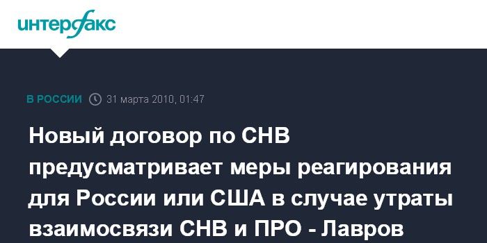 Новый договор по СНВ предусматривает меры реагирования для России или США в случае утраты взаимосвязи СНВ и ПРО - Лавров