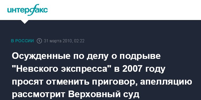 Москва. 31 марта. ИНТЕРФАКС - Верховный суд РФ рассмотрит кассационные жалобы приговоренных к длительным срокам по делу о подрыве "Невского экспресса" в 2007 году.