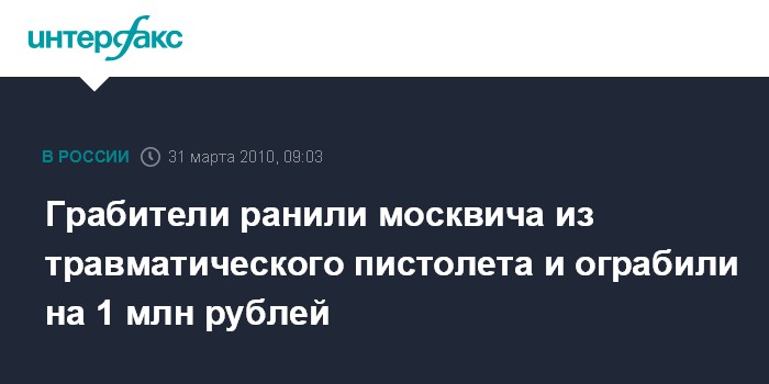 накануне вечером на западе Москвы четверо грабителей ранили из травматического пистолета неработающего жителя города и забрали у него деньги и ценности на сумму свыше 1 млн рублей. По его информации, около 22:00 в дежурную часть обратился 32-летний мужчина, который рассказал, что когда он находился в своем автомобиле "Тойота Лэндкрузер", к нему подошли четверо неизвестных, избили его, после чего ранили в ногу из травматического пистолета и забрали документы, наручные часы, золотой браслет, три телефона сотовой связи, сумку с деньгами", - рассказал собеседник агентства.