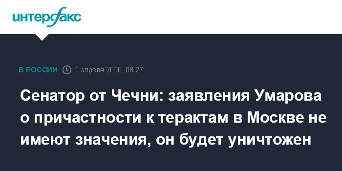 Москва. 1 апреля. INTERFAX.RU - Член Совета Федерации от Чечни Зияд Сабсаби заявил, что лидер северокавказских боевиков Доку Умаров должен быть уничтожен вне зависимости от утверждений последнего о своей причастности к организации взрывов в московском метро.