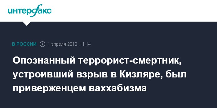 Москва. 1 апреля. INTERFAX.RU – Один из исполнителей теракта в минувшую среду в дагестанском Кизляре, которого удалось опознать в тот же день, являлся приверженцем ваххабизма и состоял на оперативном учете Кизлярского ОВД, заявляют в МВД РФ.