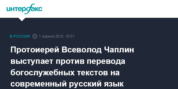 Москва. 1 апреля. INTERFAX.RU - В Русской православной церкви считают нецелесообразным перевод богослужебной литературы с церковнославянского на современный русский язык. "Не думаю, что нужно переводить богослужение с языка, который сформировался в Древней Руси, на язык клипов или SMS-сообщений", - сказал председатель синодального Отдела по взаимоотношениям Церкви и общества протоиерей Всеволод Чаплин в четверг на пресс-конференции в Москве.
