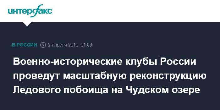 Москва. 2 апреля. ИНТЕРФАКС - В рамках праздничных мероприятий, приуроченных к 768-й годовщине знаменитого Ледового побоища, с 15 по 18 апреля участники военно-исторических клубов проведут фестиваль-реконструкцию в местах исторического противостояния новгородской дружины Александра Невского и немецких рыцарей Тевтонского ордена.