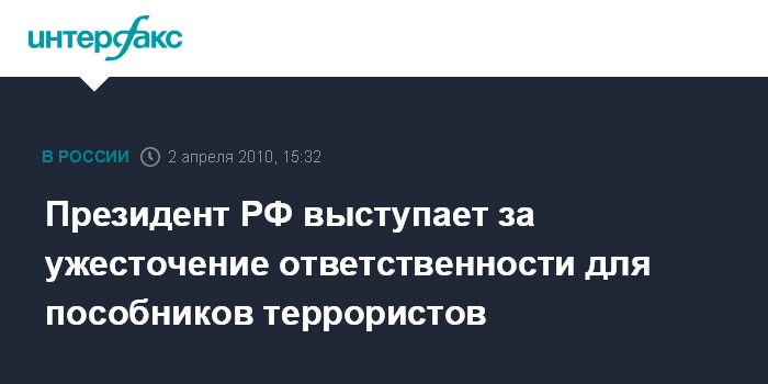 Москва. 2 апреля. INTERFAX.RU - Президент России Дмитрий Медведев предлагает серьезно ужесточить ответственность пособников террористов. Он заявил об этом на встрече с лидерами думских парламентских партий в пятницу.