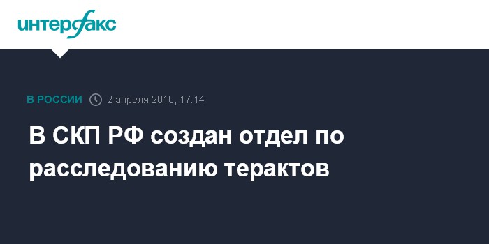 Москва. 2 апреля. INTERFAX.RU - Отдел по расследованию террористических актов создан в Следственном комитете при прокуратуре РФ. "В целях обеспечения эффективного расследования преступлений террористического характера распоряжением председателя СКП РФ в составе главного следственного управления создан отдел по расследованию преступлений террористической направленности", - говорится в сообщении на официальном сайте СКП РФ.