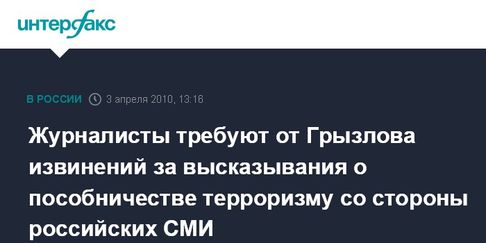Ранее спикер Госдумы Б.Грызлов в своем выступлении заявил, что публикации в газетах "Ведомости" и "МК" связаны с действиями террористов, взявших на себя ответственность за взрывы в московском метро. В частности, Б.Грызлов связывает статью А.Минкина в "МК" с заявлениями лидера боевиков Доку Умарова.