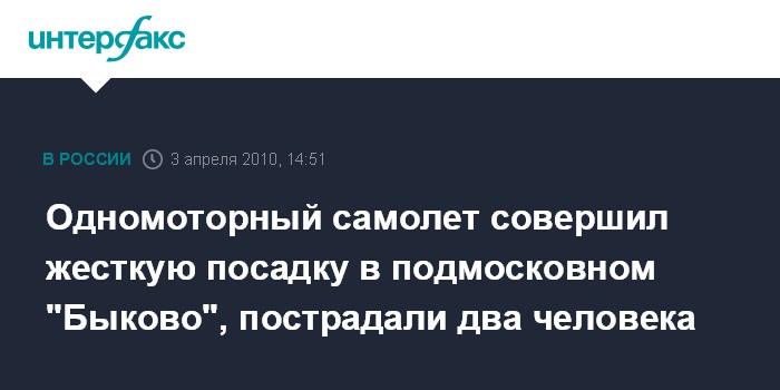 Москва. 3 апреля. INTERFAX.RU – Два человека пострадали в результате жесткой посадки небольшого самолета, произошедшей на аэродроме "Быково" в Подмосковье, сообщил "Интерфаксу" источник в правоохранительных органах в субботу.