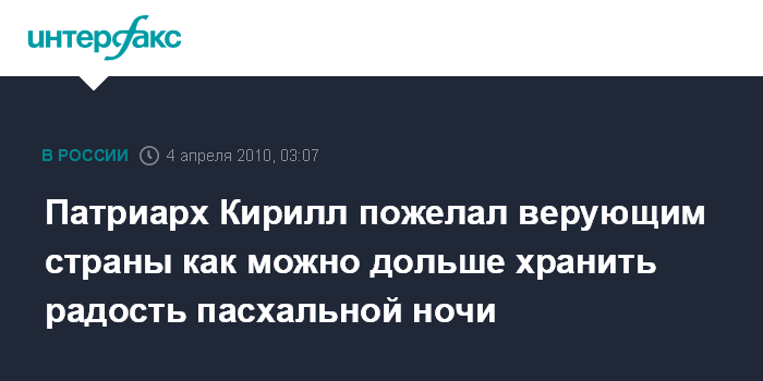 Москва. 4 апреля. ИНТЕРФАКС - Патриарх Московский и всея Руси Кирилл поздравил верующих с праздником Пасхи.