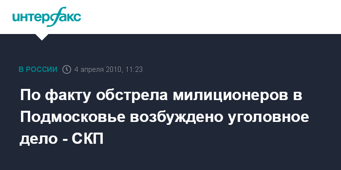 Москва. 4 апреля. INTERFAX.RU - Подмосковное управление СКП РФ возбудило уголовное дело по факту расстрела двоих сотрудников милиции города Дмитрова по статье о посягательстве на жизнь сотрудника правоохранительного органа. "Уголовное дело возбуждено по ст. 317 УК РФ", - сказала "Интерфаксу" в воскресенье официальный представитель управления Юлия Жукова.