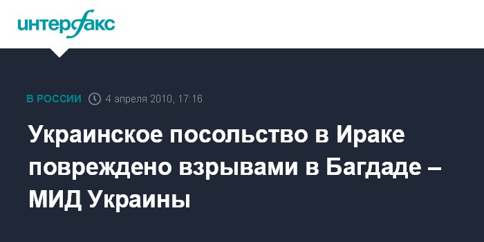 Киев. 4 апреля. INTERFAX.RU - В результате двух взрывов, прогремевших в воскресенье в Багдаде, повреждено здание посольства Украины в Ираке, сообщает пресс-служба МИД Украины. По информации ведомства, в 11:15 по местному времени в Багдаде на протяжении нескольких минут было совершено, по меньшей мере, 9 терактов. "Два взрыва прозвучали вблизи места расположения здания посольства Украины в Ираке", - говорится в сообщении. По данным дипучреждения, граждан Украины нет среди пострадавших.