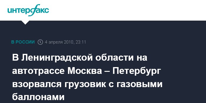 Санкт-Петербург. 4 апреля. ИНТЕРФАКС-СЕВЕРО-ЗАПАД - Взрыв произошел в 45 км от северной столицы на трассе Москва - Санкт-Петербург в кузове грузовика, перевозившего баллоны с газом, сообщает корреспондент "Интерфакса".