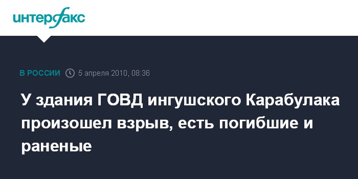 Как сообщил агентству "Интерфакс-Юг" источник в правоохранительных органах Ингушетии, взрыв произошел в 8:20 мск на автостоянке у здания ГОВД. "По предварительной информации, взрыв произошел в легковой автомашине, припаркованной у здания ГОВД. В результате взрыва есть погибшие и пострадавшие, их количество уточняется", - сказал источник.
