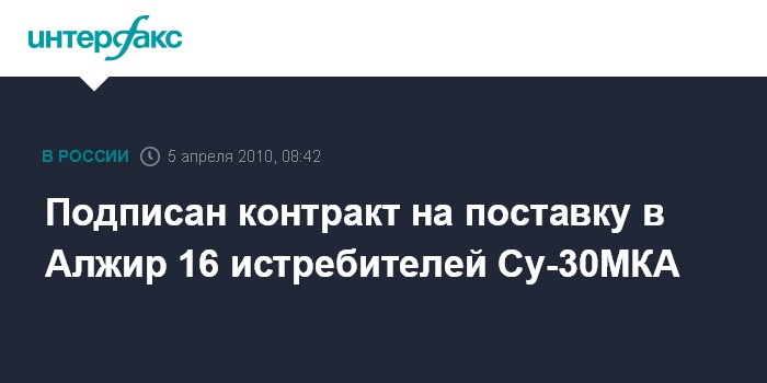 Москва. 5 апреля. INTERFAX.RU - Алжир закупил дополнительную партию из 16 многофункциональных истребителей Су-30МКА, сообщил "Интерфаксу-АВН" в понедельник военно-дипломатический источник. "Соответствующий контракт был подписан Рособоронэкспортом в Алжире две недели назад", - сказал собеседник агентства. По его словам, поставка самолетов алжирским ВВС начнется с 2011 года.