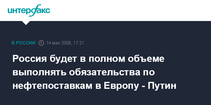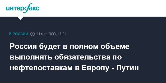 Усть-Луга. 14 мая. INTERFAX.RU - Россия и впредь намерена в полном объеме выполнять свои обязательства по нефтепоставкам, в том числе перед европейскими потребителями, заявил на совещании в Усть-Луге премьер-министр РФ Владимир Путин.