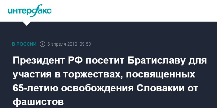 Москва. 6 апреля. INTERFAX.RU - Президент РФ Дмитрий Медведев отправляется во вторник с двухдневным официальном визитом в Словакию. Визит приурочен к 65-й годовщине освобождения Братиславы Красной Армией (4 апреля 1945 г.).