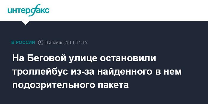 Москва. 6 апреля. INTERFAX.RU - Пассажиры одного из троллейбусов на Беговой улице эвакуированы из салона из-за подозрительного пакета, обнаруженного в салоне, сообщил "Интерфаксу" источник в правоохранительных органах во вторник. Он рассказал, что в настоящее время троллейбус стоит на Беговой улице в районе дома № 17, корпус 1.