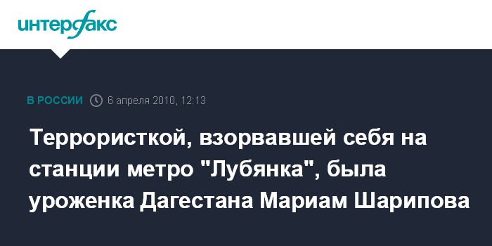 Москва. 6 апреля. INTERFAX.RU - Федеральный оперативный штаб (ФОШ) Национального антитеррористического комитета (НАК) сообщил, что теракт на станции метро "Лубянка" 29 марта совершила террористка-смертница Мариам Шарипова из Дагестана.