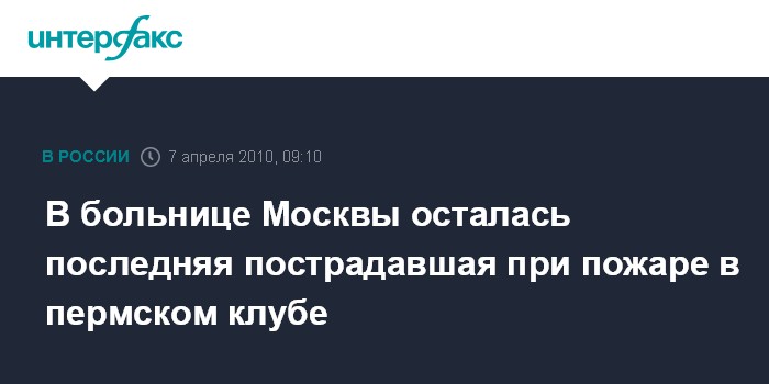 Москва. 7 апреля. INTERFAX.RU - Из института имени Вишневского в Москве выписана еще одна пострадавшая при пожаре в пермском ночном клубе "Хромая лошадь".