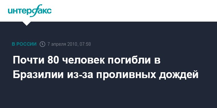 Москва. 7 апреля. INTERFAX.RU - Проливные дожди привели к гибели минимум 79 человек в бразильском штате Рио-де-Жанейро, сообщила местная служба гражданской обороны.
