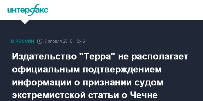 Издательство "Терра" не располагает официальным подтверждением информации о признании судом экстремистской статьи о Чечне
