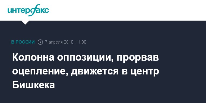 Москва. 7 апреля. INTERFAX.RU - Колонна оппозиции, прорвав милицейское оцепление, движется в центр Бишкека, возможно, к зданию правительства, сообщают очевидцы. Кроме того, по словам свидетелей, в Бишкек движутся колонны демонстрантов из окрестных населенных пунктов.