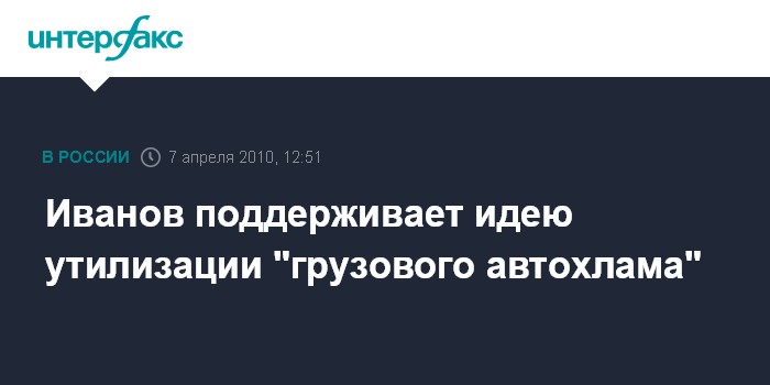 Москва. 7 апреля. INTERFAX.RU - Вице-премьер РФ Сергей Иванов считает правильной идею о введении в РФ программы утилизации старых грузовых автомобилей по аналогии с такой же программой, действующей сейчас в отношении легковых автомобилей. "Сама идея распространить практику замены автохлама на автомобили с современными экологичными двигателями - это хорошая идея. Я ее поддерживаю. И как мы легковой хлам утилизируем, так же надо и грузовой автохлам утилизировать", - сказал Иванов в среду на заседании Союза транспортников РФ.