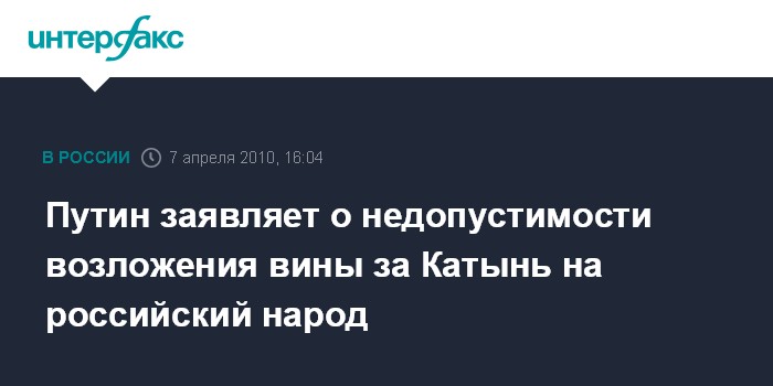 Путин заявляет о недопустимости возложения вины за Катынь на российский народ