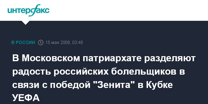 Москва. 15 мая. ИНТЕРФАКС - В Русской православной церкви считают, что победа "Зенита" в финале Кубка УЕФА - показатель возрождения России.