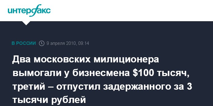 Два московских милиционера вымогали у бизнесмена $100 тысяч, третий – отпустил задержанного за 3 тысячи рублей