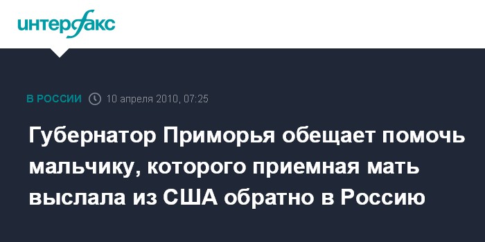Как сказал С.Дарькин, с Артемом американская приемная мать поступила жестоко. "Мы возмущены тем, что маленький ребенок один был отправлен в сложный и длительный перелет, и со своей стороны сделаем все, чтобы защитить его права на достойное детство", - сказал глава региона.