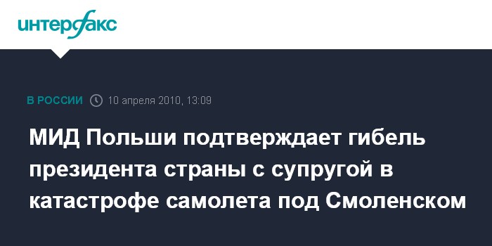 МИД Польши подтверждает гибель президента страны с супругой в катастрофе самолета под Смоленском