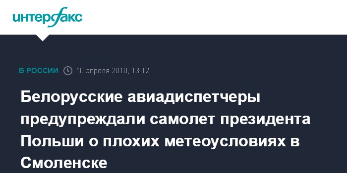 "Незадолго до выхода из зоны ответственности белорусских авиадиспетчеров к ним обратились российские коллеги с просьбой передать на борт информацию о плохих метеоусловиях посадки в Смоленске. Белорусские диспетчеры передали на борт Ту-154 данную информацию, но польские пилоты приняли решение следовать в Смоленск", - отметил собеседник агентства.