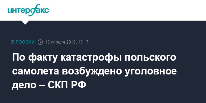 Москва. 10 апреля. INTERFAX.RU - По факту крушения самолета президента Польши Леха Качиньского возбуждено уголовное дело по статье о нарушении правил безопасности при полетах. "По факту крушения самолета Ту-154 на окраине Печерска (Смоленская область) следственным управлением СКП РФ по Смоленской области возбуждено уголовное дело по признакам преступления, предусмотренного ч.3 ст.263 УК РФ (нарушение правил безопасности движения воздушного транспорта, повлекшее по неосторожности смерть двух и более лиц)", - сообщил "Интерфаксу" официальный представитель СКП РФ.