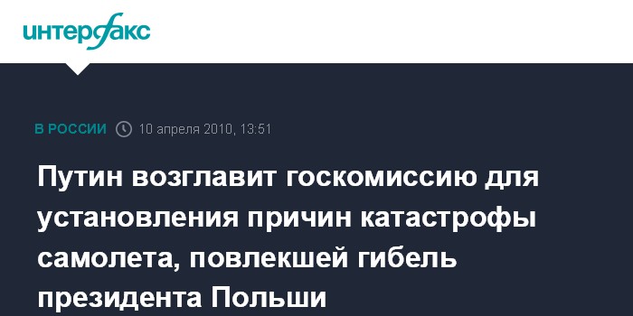 Путин возглавит госкомиссию для установления причин катастрофы самолета, повлекшей гибель президента Польши