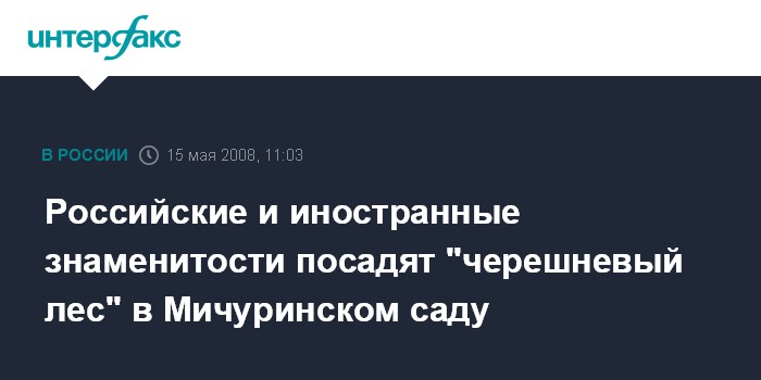 Москва. 15 мая. INTERFAX.RU - Известные люди примут участие в работах по благоустройству территории Мичуринского сада в воскресенье, сообщили "Интерфаксу" в пресс-центре ОАО "ГАО ВВЦ". "На работу как на праздник!" - под таким лозунгом известного российского биолога и селекционера Ивана Мичурина 18 мая в Мичуринском саду Всероссийского выставочного центра в рамках Международного открытого фестиваля искусств "Черешневый лес" пройдет воскресник", - рассказал собеседник агентства.
